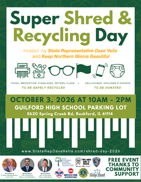 State Rep. Dave Vella's Super Shred & Recycling Day Held at 5620 Spring Creek Rd, Rockford, IL (Guilford High School Parking Lot) from 10 am to 2 pm. Includes document shredding, medication disposal, and recycling.